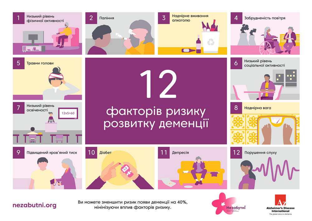 🔎 Хоч ми й не можемо змінити генетику чи зупинити старіння, можливо зменшити ризик виникнення деменції — як за допомогою індивідуальної зміни способу життя, так і глобальної — на рівні суспільства. Згідно з наявною доказовою базою на основі дедалі більшої кількості досліджень, є 12 факторів ризику, на які потенційно можна впливати. Взявши їх до уваги та впровадивши зміни у своє життя, ми можемо запобігти розвитку синдрому або принаймні відтермінувати до 40% випадків деменції.