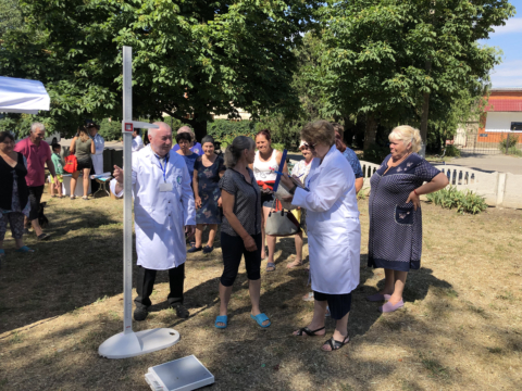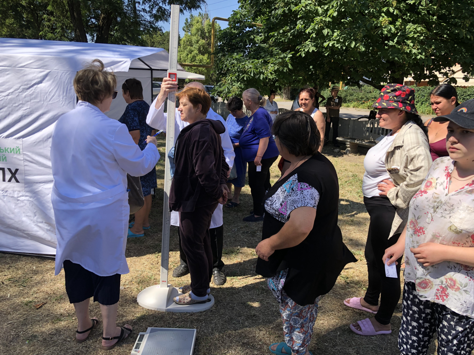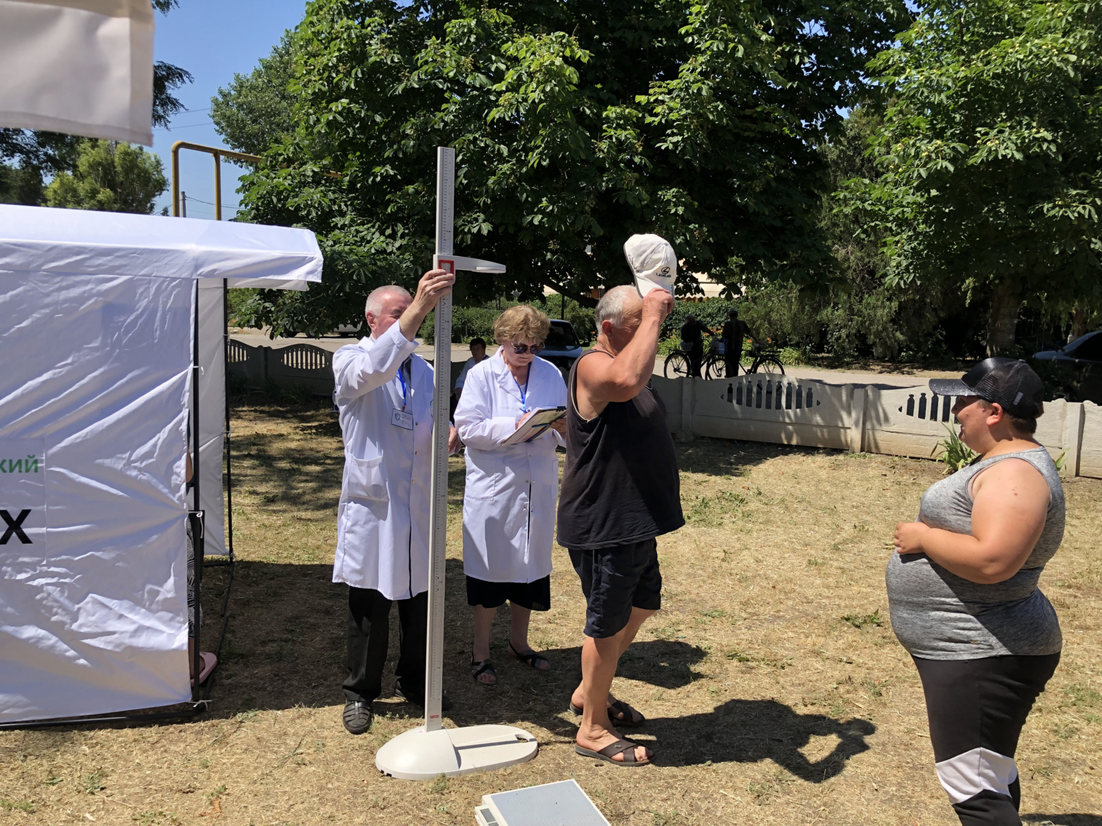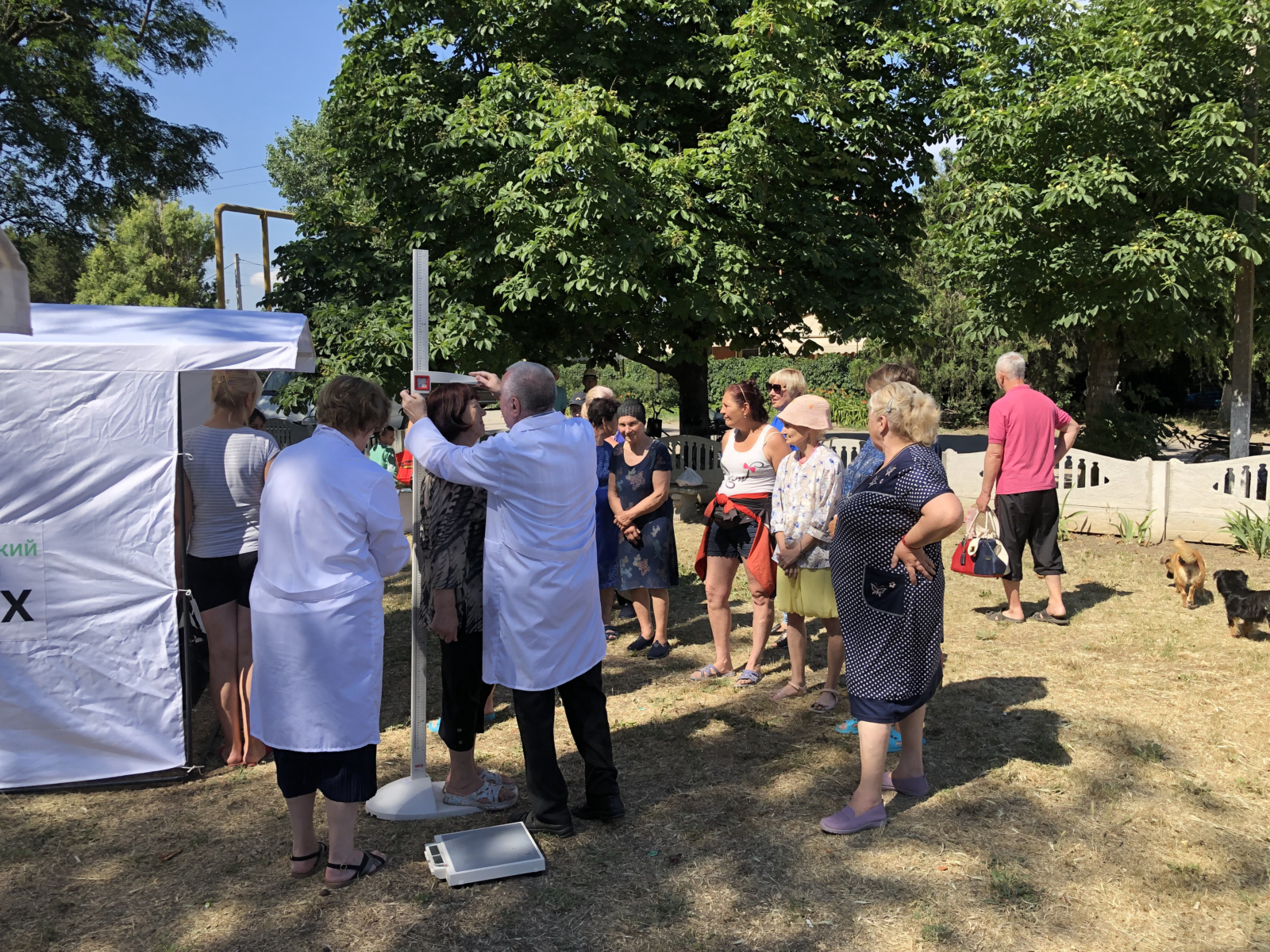 Виїзна мобільна бригада проводила скринінг артеріального тиску та рівня глюкози крові, паралельно з цим пояснюючи важливість цих процедур. Наші фахівці допомагали бажаючим розраховувати індекс маси тіла (ІМТ), серцево-судинні ризики за допомогою шкали SCORE, добову потребу в калоріях залежно від рівня активності та ін.
