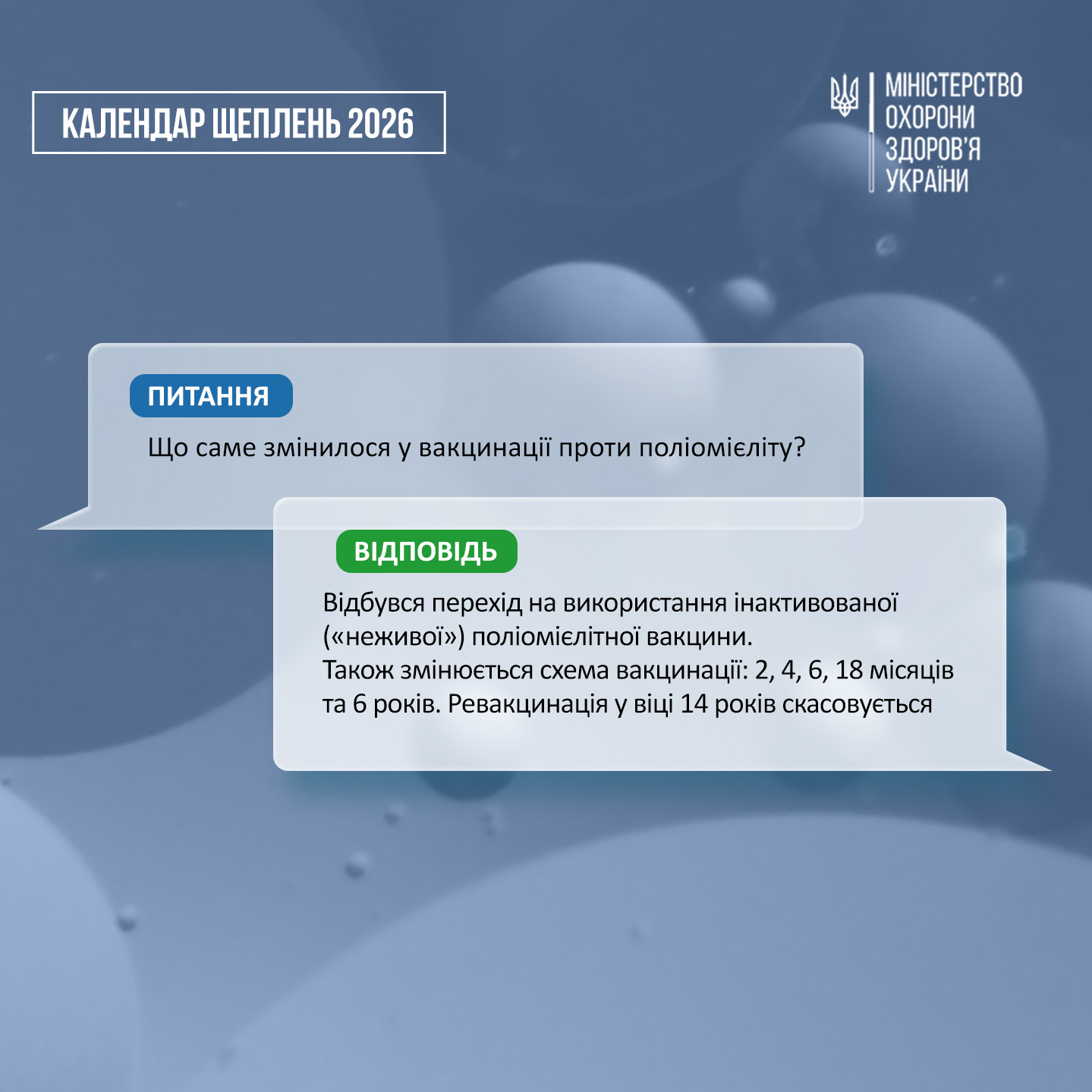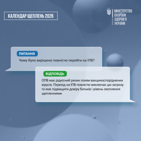 💬 Відбувся перехід на використання інактивованої («неживої») поліомієлітної вакцини, оральна поліомієлітна вакцина (ОПВ) більше не застосовуватиметься. Також змінюється схема вакцинації. Тепер вона складається з 5 щеплень, які проводяться у віці 2, 4, 6, 18 місяців та 6 років. Ревакцинація у віці 14 років скасовується.