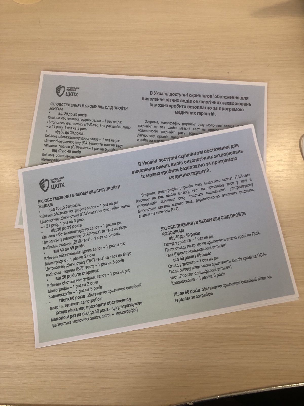 Фахівцями відділу епідеміологічного нагляду (спостереження) та контролю неінфекційних хвороб Херсонського обласного ЦКПХ, було розроблено та надруковано пам’ятки для пацієнтів з переліком доступних безоплатних скринінгових обстежень для виявлення різних видів онкологічних захворювань, залежно від віку. Пам’ятки розповсюджувалися серед відвідувачів закладів охорони здоров’я міста, з роз’ясненнями щодо важливості профілактики онкологічних хвороб та їх ранньої діагностики і лікування.