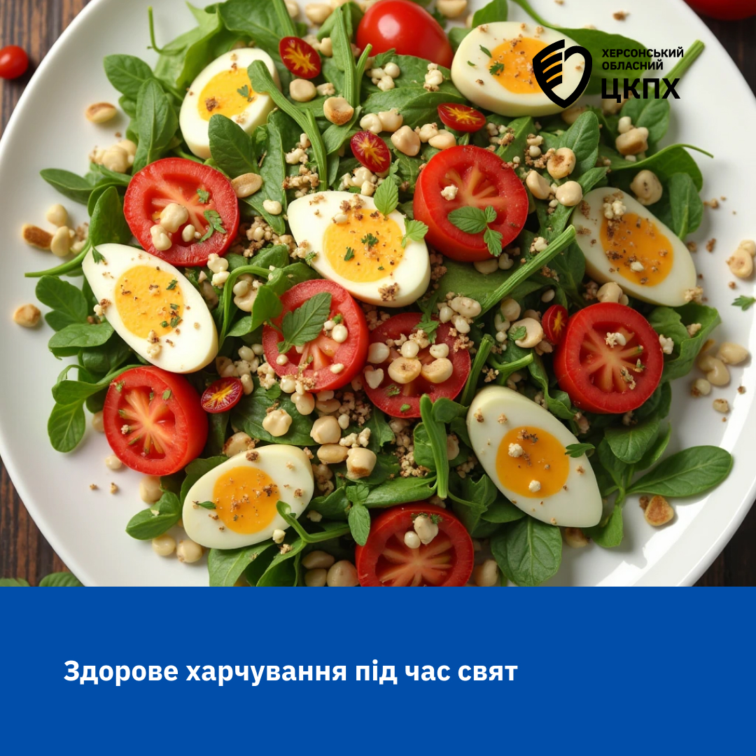 📌 Наповніть святковий стіл здоровими стравами. Використовуйте в рецептах багато овочів і цільнозернових продуктів, обирайте нежирне м’ясо птиці або рибу. Салати заправляйте рослинними оліями: оливковою, соняшниковою тощо. Навіть у період новорічних свят не забувайте про тарілку здорового харчування! (50% раціону — овочі та фрукти, 25% — білкова їжа, 25% — цільнозернові продукти).