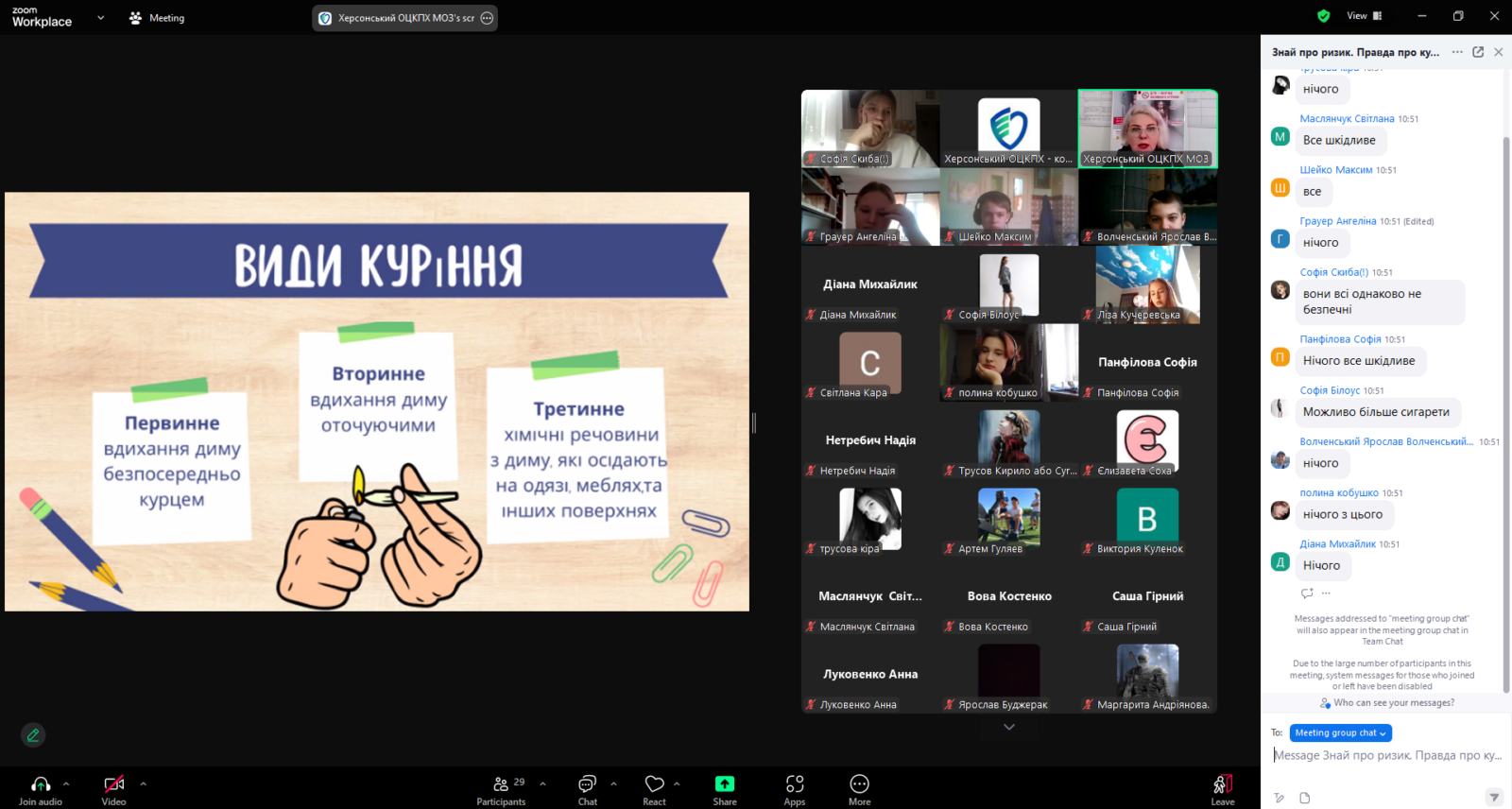 5 грудня 2024‼️Продовжуємо мотивувати учнів обирати здоровий спосіб життя. З цією метою фахівцями відділу профілактики неінфекційних хвороб ДУ «Херсонський ОЦКПХ МОЗ» проводяться інтерактивні заняття в онлайн форматі з циклу «Зроби вибір на користь здоровʼя» для школярів міста Херсон.